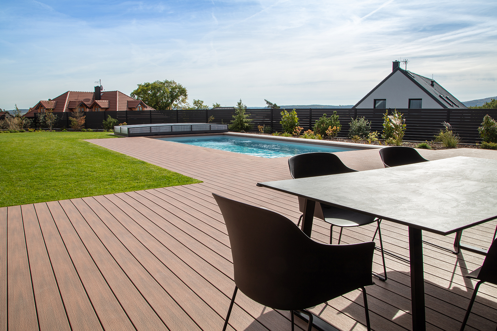 Terasa Forest Palisander skvěle propojuje dům s bazénem a nádhernými výhledy do okolní krajiny.