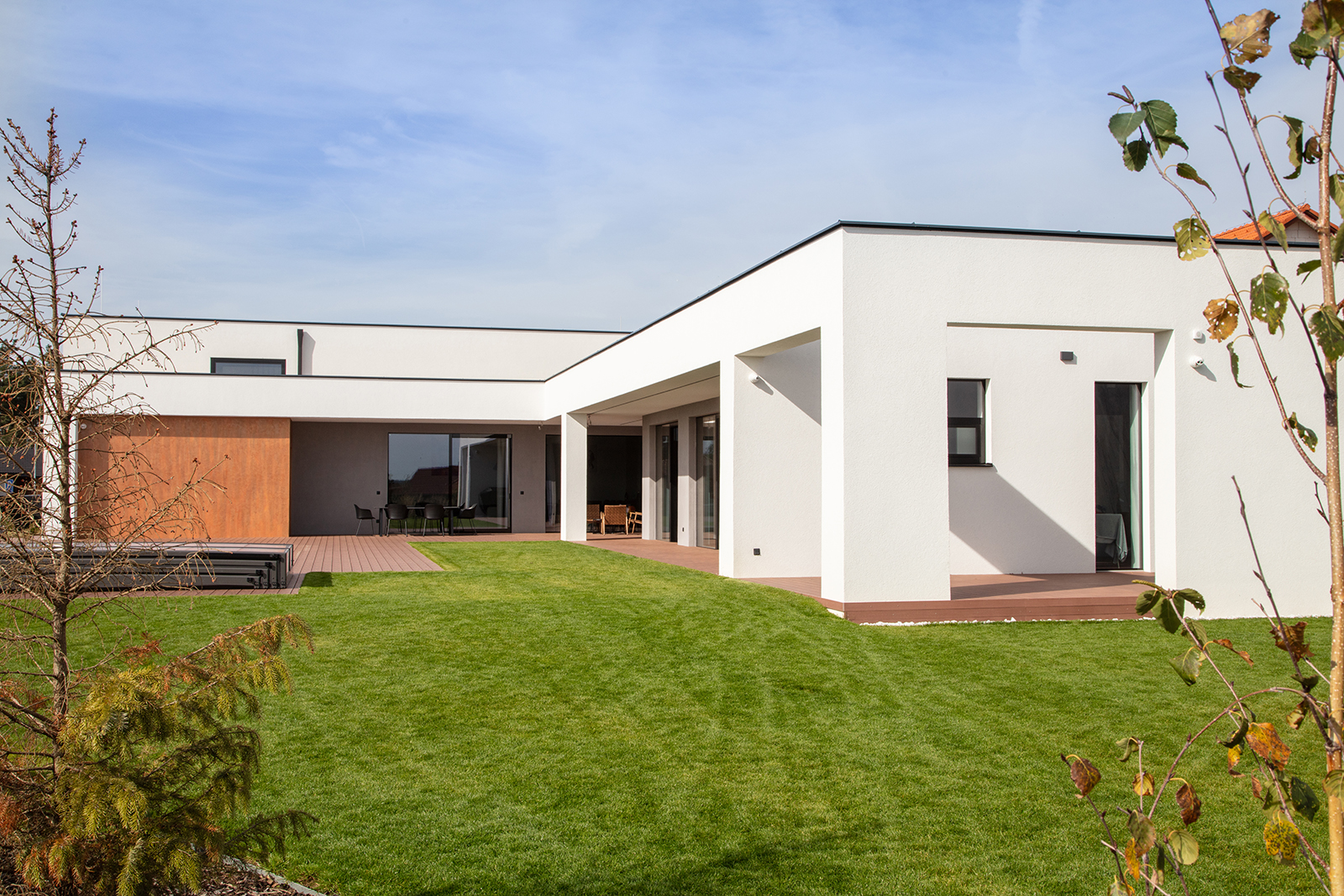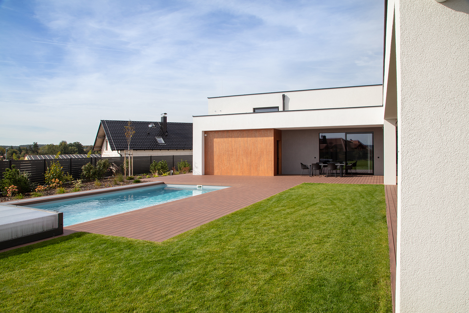Majitelům stavebního pozemku nedaleko řeky Radbuzy se podařilo sladit vše v dokonalé harmonii. Bělostně čisté minimalistické linie domu působí jako z první republiky a k cestě od velkých francouzských oken k modernímu zapuštěnému bazénu skrze precizně střižený pažit zve hebká terasa z kompozitního dřeva.