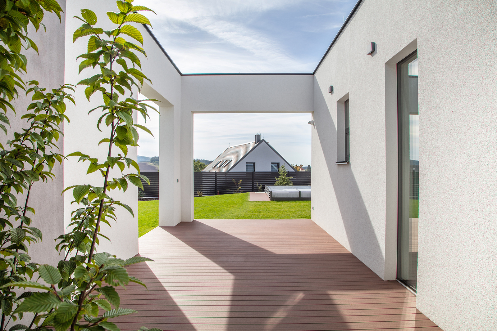 Rodinná novostavba v západních Čechách dokonale snoubí eleganci s funkčností. K atraktivnímu vzhledu domu a jeho bezprostředního okolí přispívá i na první pohled jednoduchá, částečně zastřešená terasa z kompozitních prken Terafest®.