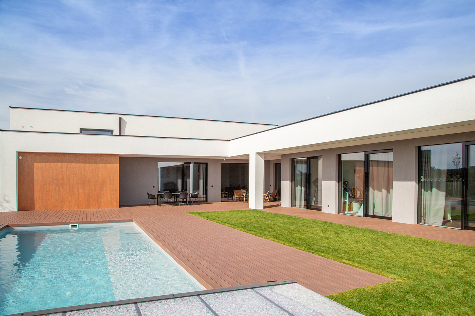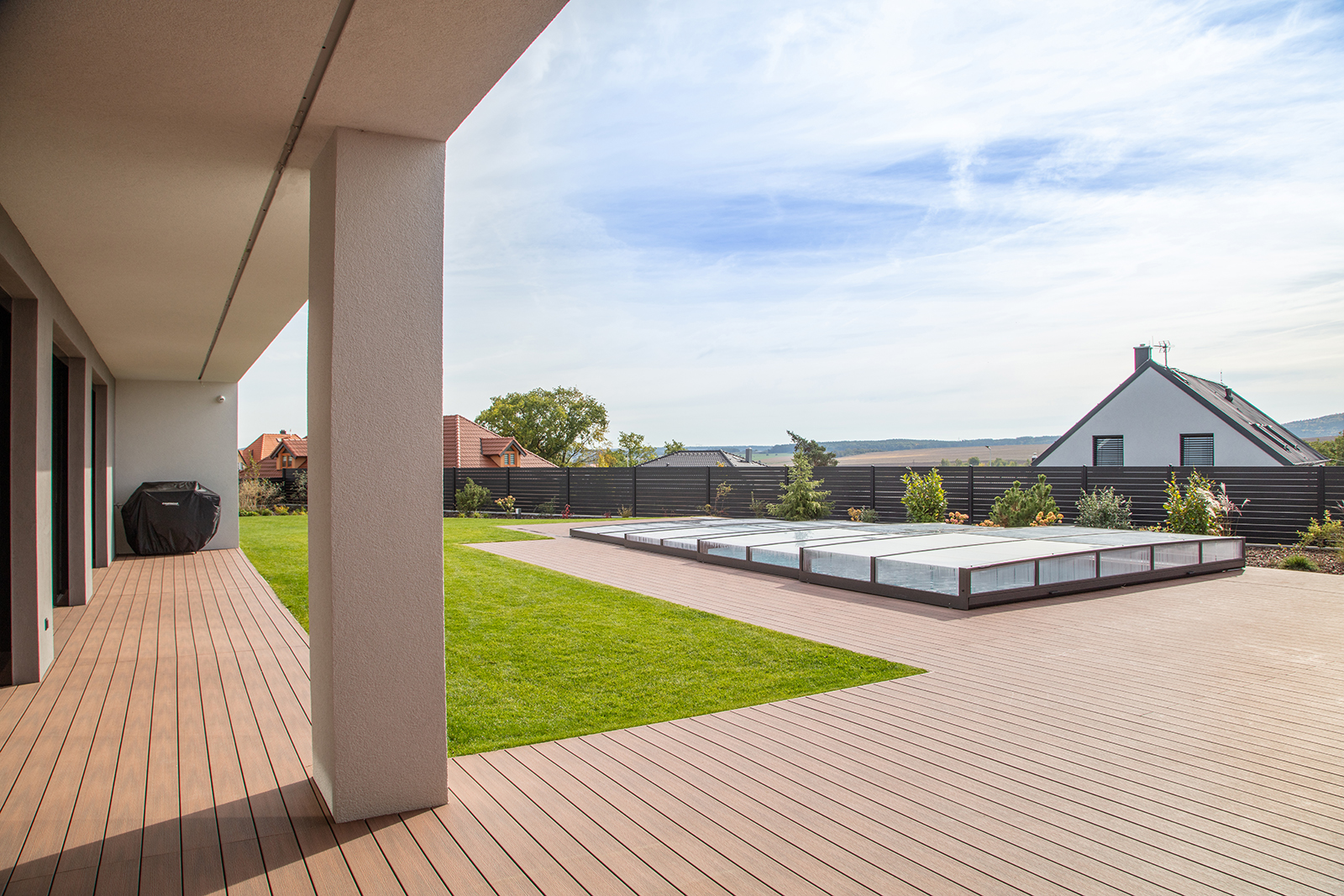 Částečně zakrytá terasa byla navržena tak, aby propojovala obytnou část domácnosti s exteriérem, a umožnila tak rodině přirozený pohyb mezi oběma prostory. Nová terasa rozšiřuje obytný prostor o dalších 140 m² bezpečné plochy, jejíž atraktivitu zvyšuje i jednoduše působící, svým designem i rozměry dokonale ladící bazén. – Doma, a přesto na čerstvém vzduchu, v přírodě, a stále na dosah všech myslitelných vymožeností svého soukromí.
